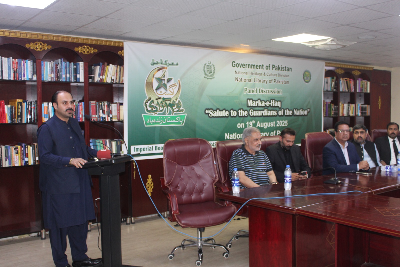 On August 19, 2025, an insightful panel discussion titled “Marqa-e-Haq; Salute to Guardians of the Nation” was held at the National Library of Pakistan, Islamabad. The event was organized by the National Heritage and Culture Division, Government of Pakistan and it was moderated by Mr. Khalid Taimur Akram, the Executive Director of the Pakistan Research Center for a Community with Shared Future (PRCCSF), who also extended his support to the National Library of Pakistan in organizing this significant discussion and made it more impactful.