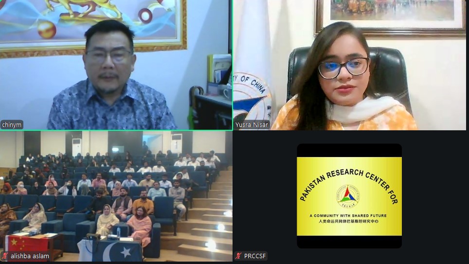 Following the physical lecture, the online training session commenced, moderated and introduced by Ms. Yusra Binte Nisar, Research Assistant at the Pakistan Research Centre for a Community with Shared Future (PRCCSF), Islamabad.