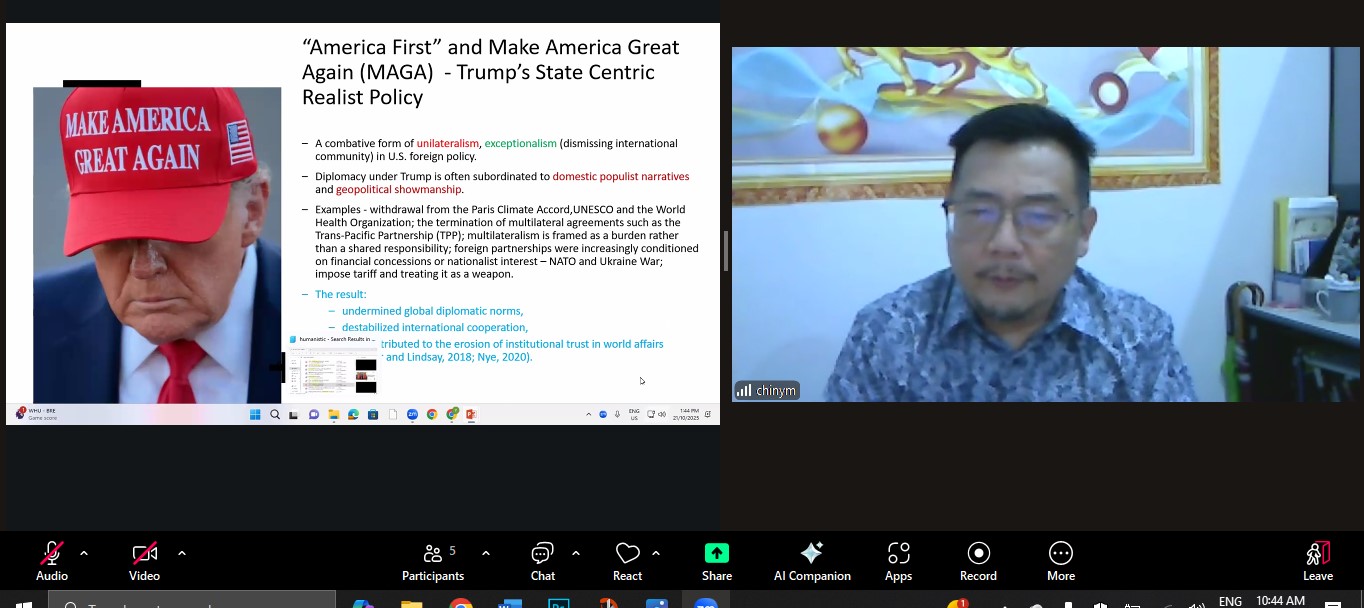 Using Malaysia–China relations as a case study, Dr. Chin traced the historical trajectory of bilateral relations since 1964, explaining how both countries overcame ideological and political divisions to establish a relationship rooted in mutual trust, respect, and cooperation. He underscored how this partnership, strengthened through the Belt and Road Initiative (BRI), exemplifies the practical application of humanistic diplomacy in fostering regional peace, prosperity, and people-to-people connectivity.