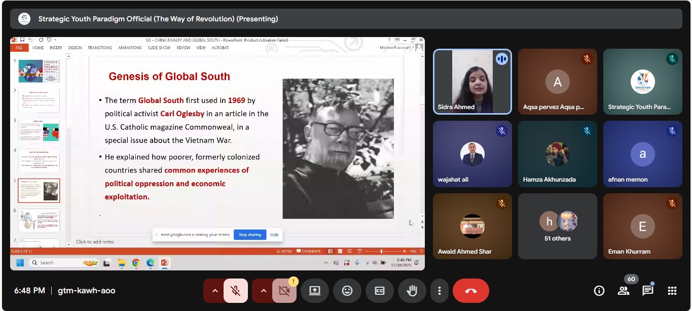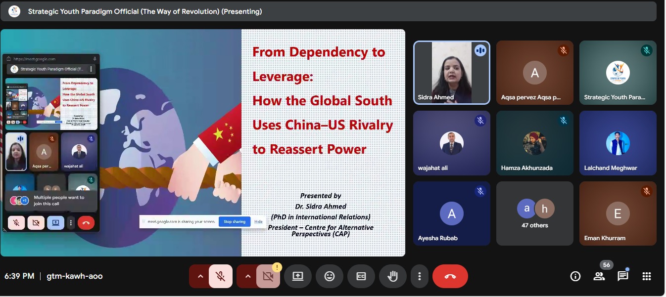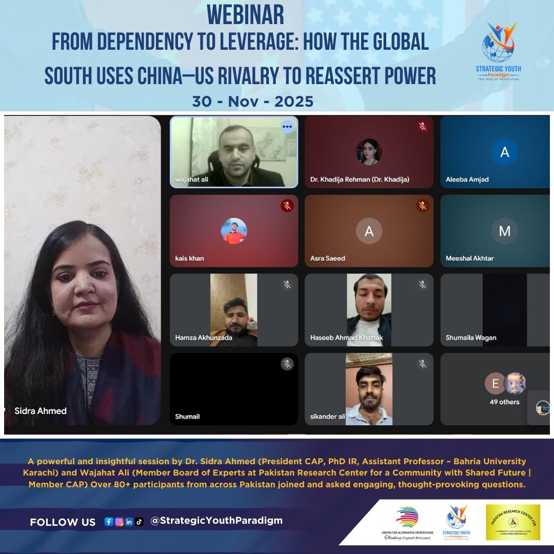 On 30th November 2025, Mr. Wajahat Ali, Member Board of Experts, Pakistan Research Center for a Community with Shared Future (PRCCSF) and Member of Centre for Alternative Perspectives (CAP), participated as a distinguished speaker in the webinar titled “From Dependency to Leverage: How the Global South Uses China–US Rivalry to Reassert Power.” The event was organized by Strategic Youth Paradigm (SYP) as part of its initiative to promote informed dialogue on global political trends and their impact on developing nations.