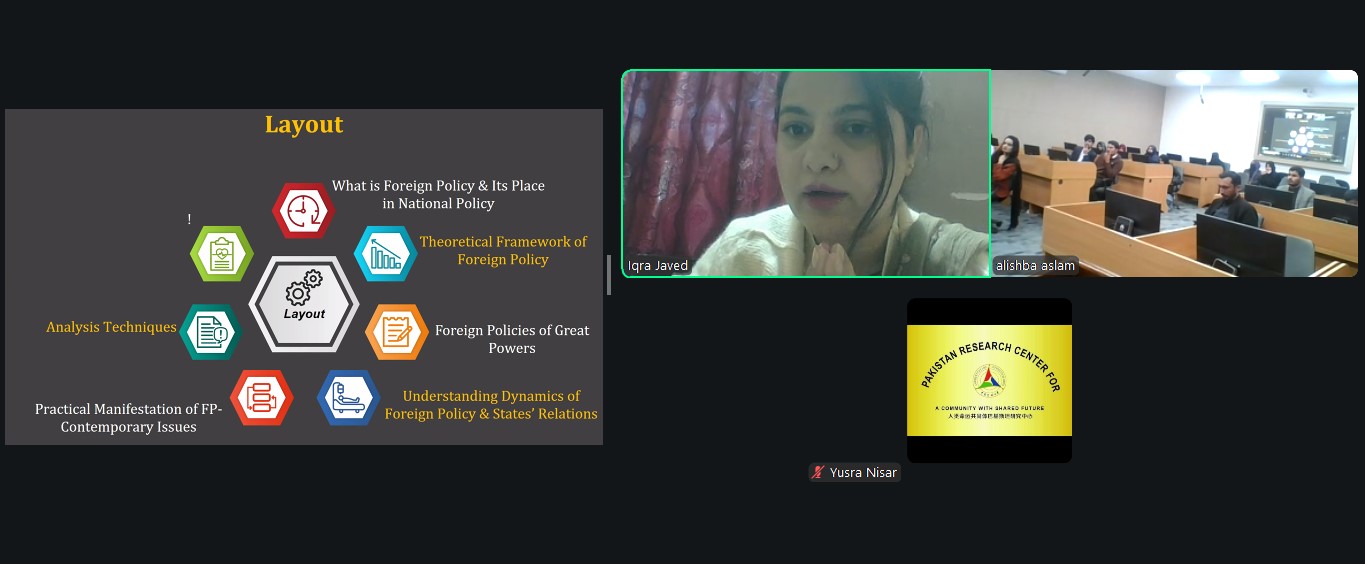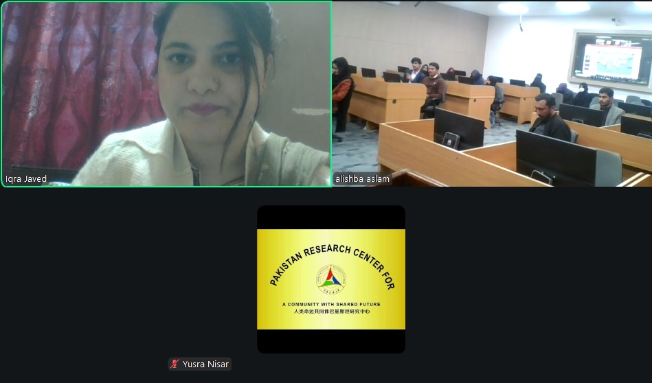 The session was led by Ms. Iqra Javaid, Lecturer and Research Associate at the University of Lahore, and Member of the Board of Experts at the Pakistan Research Center for a Community with Shared Future (PRCCSF). Ms. Iqra is a recognized expert on China’s engagement with Kazakhstan, Turkmenistan, and Central Asia, with particular focus on China’s regional diplomacy and connectivity-driven development strategies. She also possesses extensive expertise on China’s major development initiatives, especially the Belt and Road Initiative (BRI).